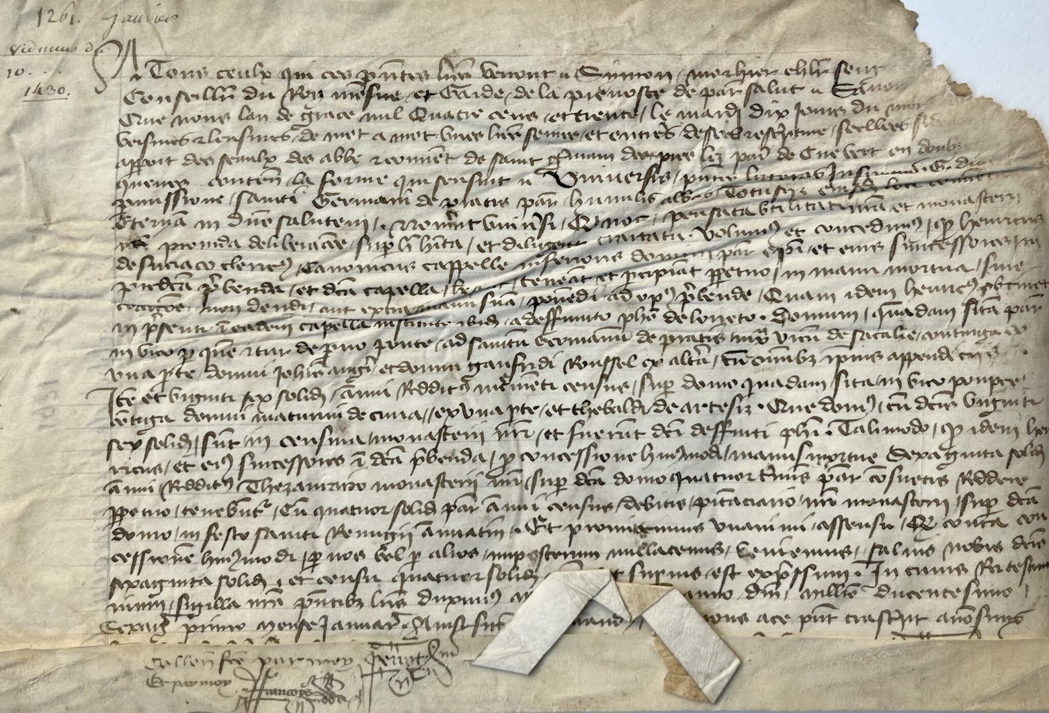Vidimus, c'est-à-dire confirmation d'un acte antérieur, daté du mardi 10 du mois [mot manquant] 1430, d'un document de janvier 1261, en latin.