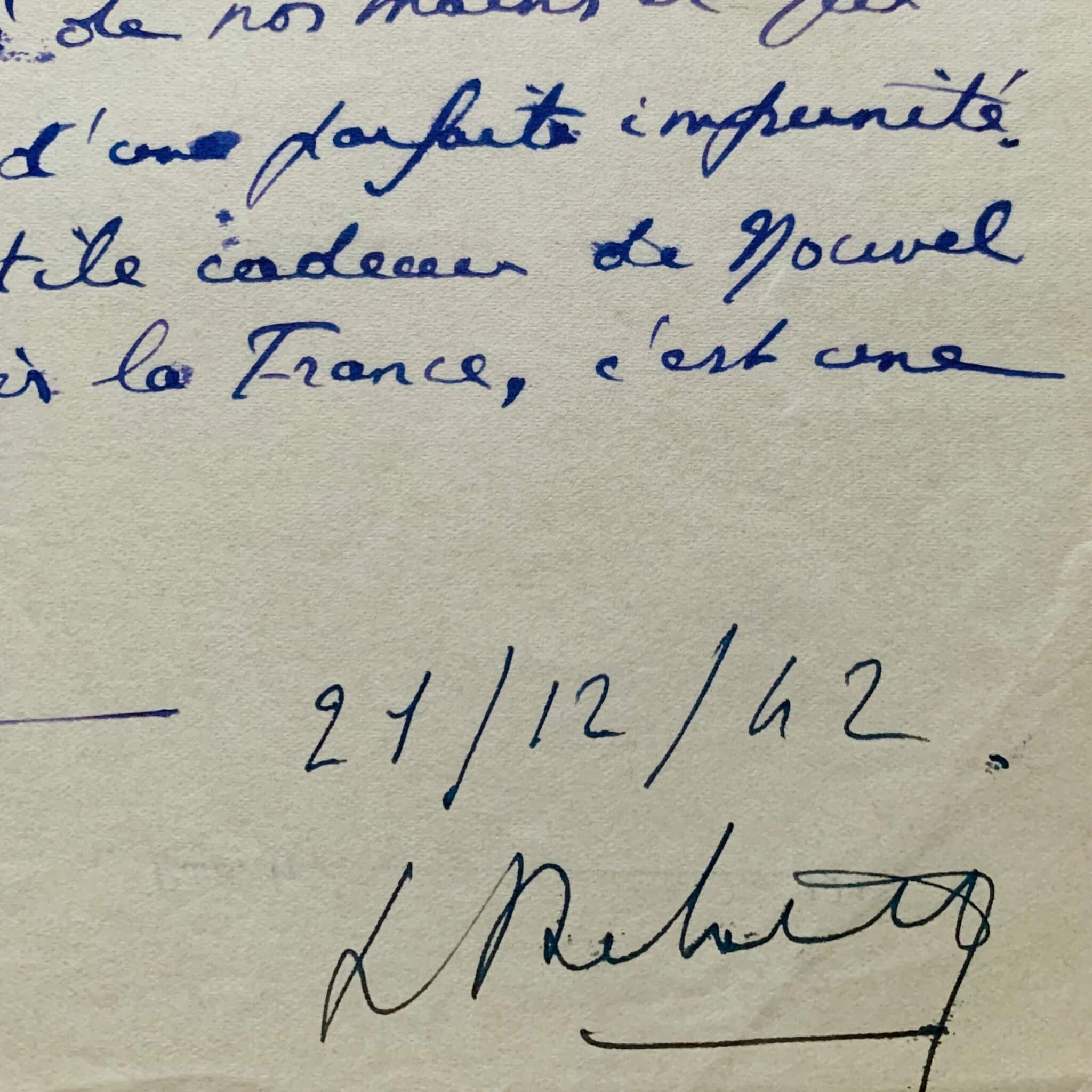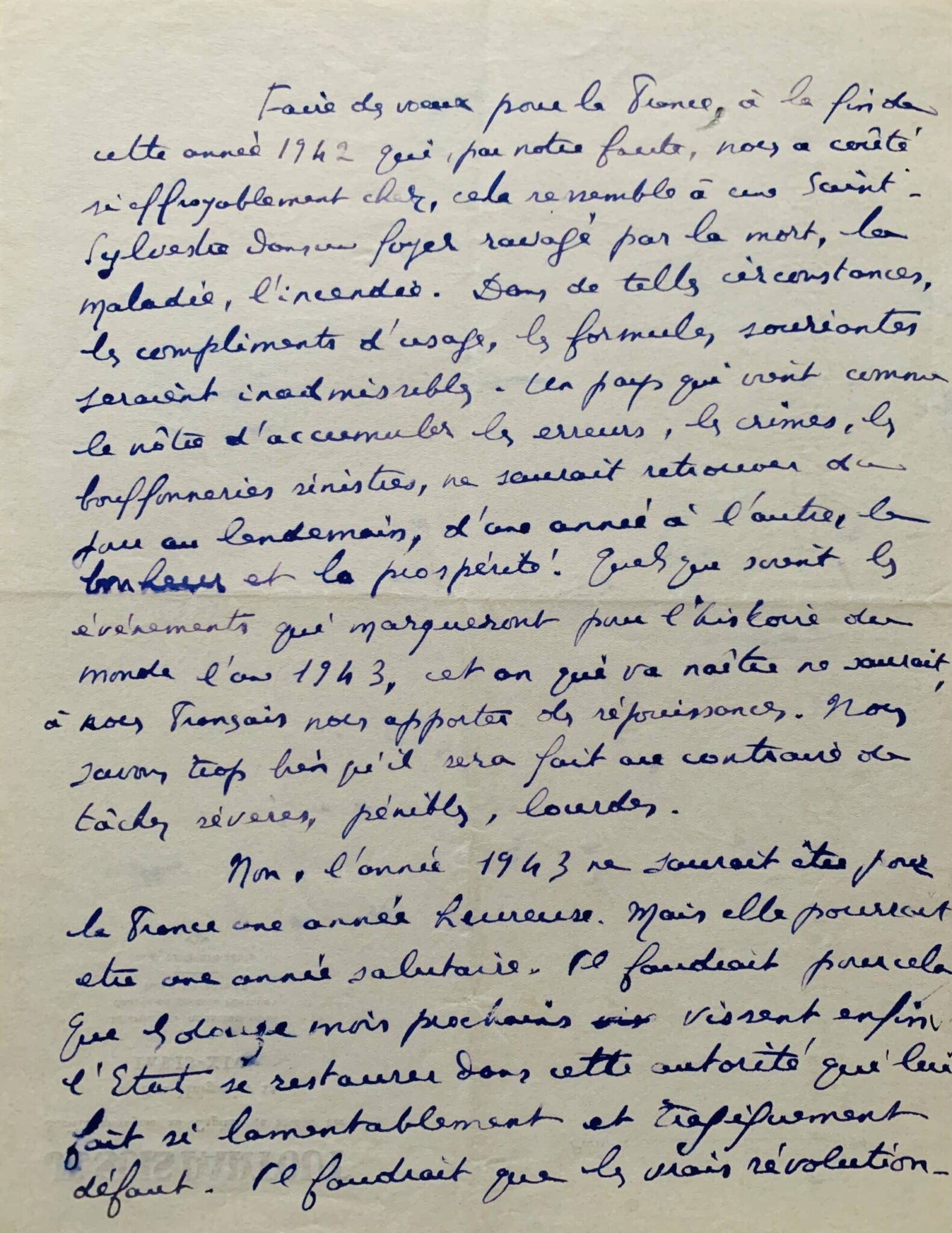 "Faire des voeux pour la France, à la fin de cette année 1942 qui, par notre faute, nous a coûté si effroyablement cher, cela ressemble à une Saint-Sylvestre dans un foyer ravagé par la mort, la maladie, l'incendie. Dans de telles circonstances, les compliments d'usage, les formules souriantes seraient inadmissibles. Un pays qui vient comme le nôtre d'accumuler les erreurs, les crimes, les bouffonneries sinistres, ne saurait retrouver du jour au lendemain, d'une année à l'autre, le bonheur et la prospérité. Quels que soient les événements qui marqueront pour l'histoire du monde l'an 1943, cet an qui va naître ne saurait, à nous Français, nous apporter des réjouissances. Nous savons trop bien qu'il sera fait au contraire de tâches sévères, pénibles, lourdes.