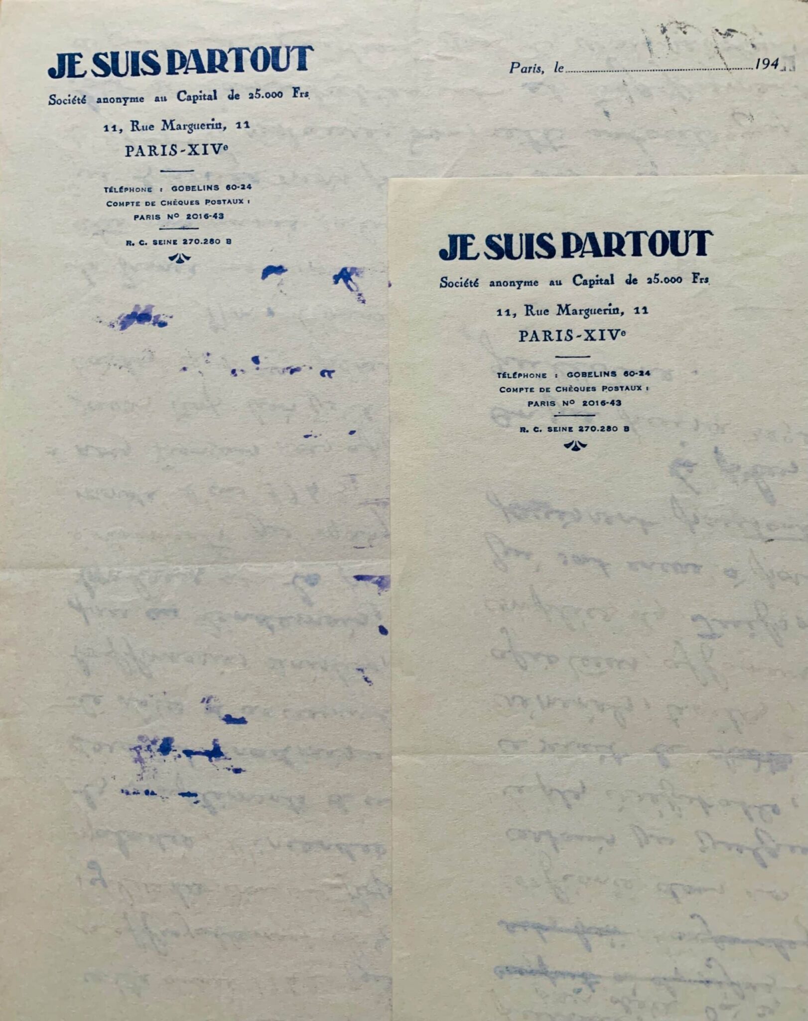 Lucien Rebatet (Moras-en-Valloire, 1903/1972)Manuscrit d'un violent texte de Rebatet : ses voeux pour la France en 1943. Il est écrit au dos de feuillets à l'entête de Je suis Partout, ce qui laisse supposer qu'il était probablement destiné à ce journal. Rebatet venait de publier Les Décombres, pamphlet antisémite et collaborationniste, dans lequel il désignait les Juifs, les politiques et les militaires comme responsables de la défaite de 40.