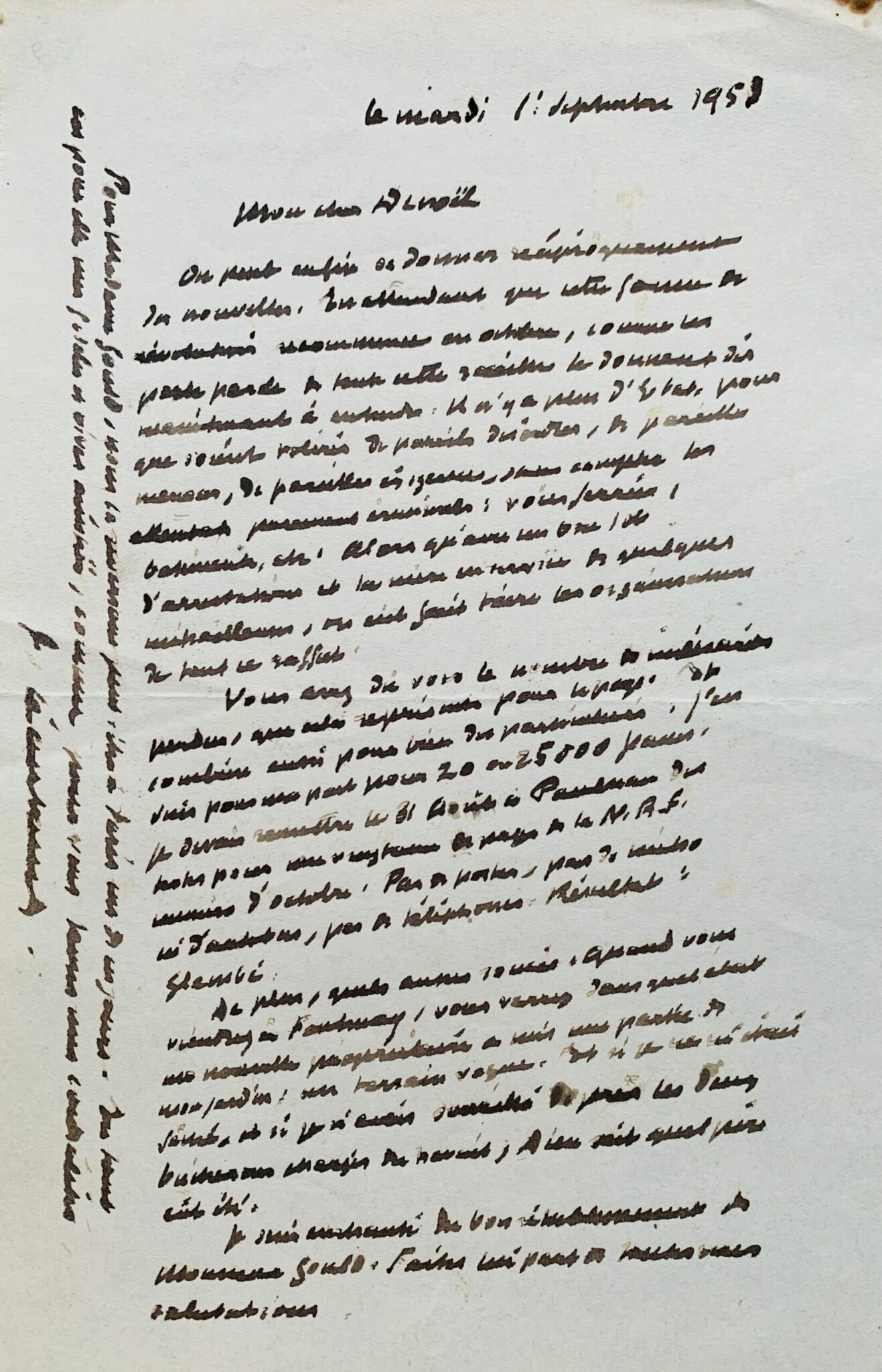 Vous avez dû voir le nombre de millions perdus que cela représente pour le pays. Et combien aussi, pour bien des particuliers. J'en suis pour ma part pour 20 ou 25.000 francs. Je devais remettre le 31 août à Paulhan des notes pour une vingtaine de pages de la N.R.F. numéro d'octobre. Pas de postes, pas de métro ni d'autobus, pas de téléphone. Résultat : flambé.