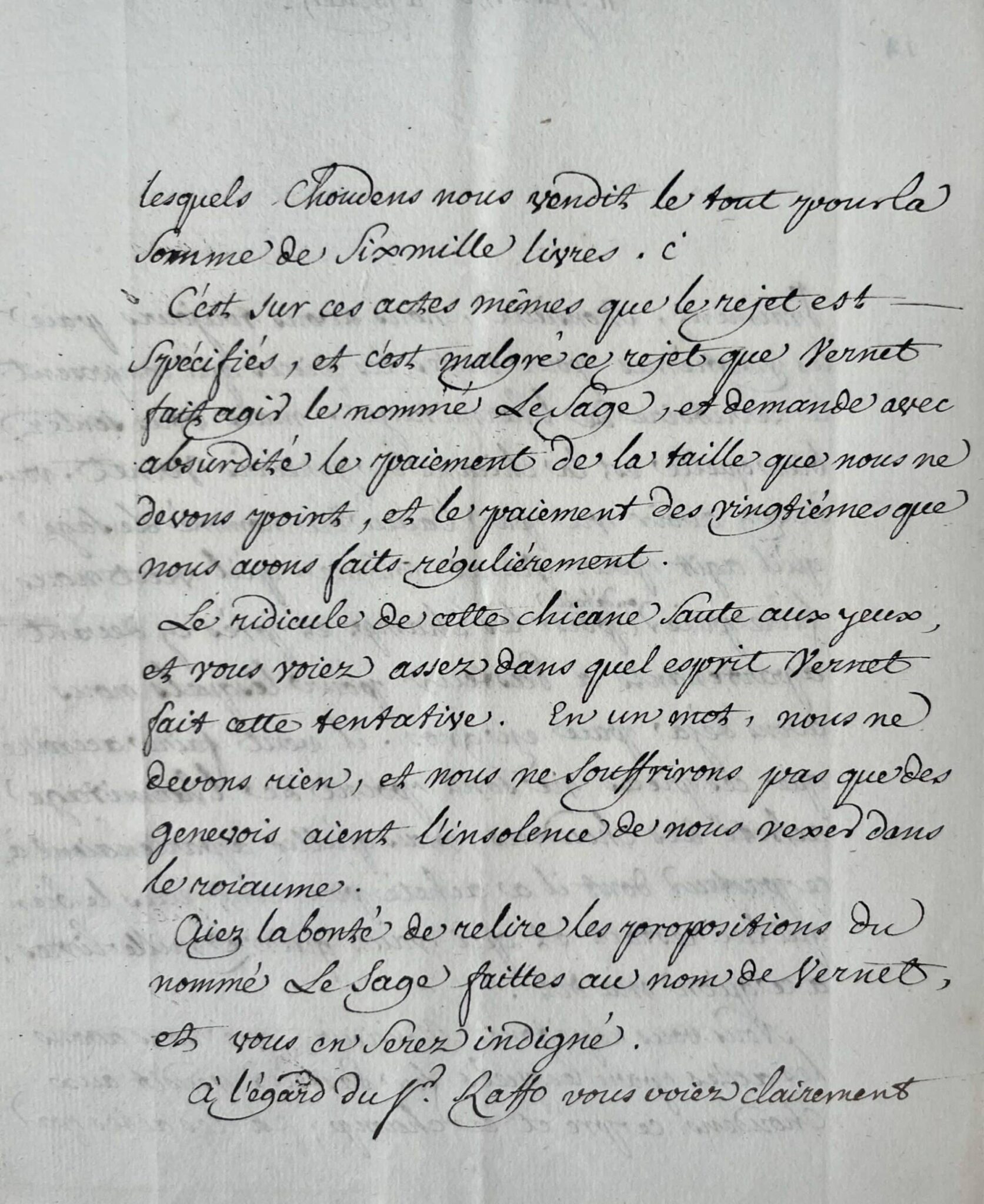 Nous vous répétons, Monsieur, que nous avons les actes par lesquels feu Pasteur vendit aux Choudens ce pré et ce champ ; et les actes par les quels Choudens nous vendit le tout pour la somme de six mille livres. C'est sur ces actes mêmes que le rejet est spécifié, et c'est malgré ce rejet que Vernet fait agir le nommé Le Sage, et demande avec absurdité le paiement de la taille que nous ne devons point, et le paiement des vingtièmes que nous avons faits régulièrement. Le ridicule de cette chicane saute aux yeux, et voiez assez dans quel esprit Vernet fait cette tentative. En un mot, nous ne devons rien, et nous ne souffrirons pas que des genevois aient l'insolence de nous vexer dans le roiaume. Aiez la bonté de relire les propositions du nommé Le Sage faittes au nom de Vernet, et vous en serez indigné".