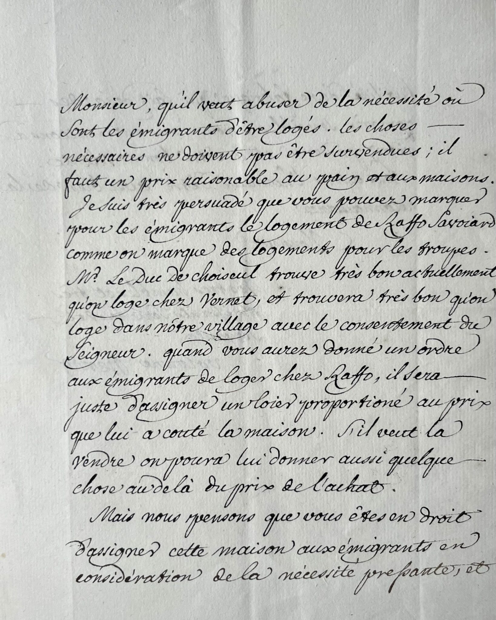 Puis Voltaire, philanthrope, dénonce la situation sociale urgente des émigrés et accuse un certain Ruffo de chercher à tirer profit de leur détresse : "A l'égard du Sr Raffo vous voiez clairement, Monsieur , qu'il veut abuser de la nécessité où sont les émigrants d'être logés. Les choses nécessaires ne doivent pas être survendues ; il faut un prix raisonable au pain et aux maisons. Je suis très persuadé que vous pouvez marquer pour les émigrants le logement de Raffo savoiard comme on marque des logements pour les troupes. Mr. Le Duc de Choiseul trouve très bon actuellement qu'on loge chez Vernet, et trouvera très bon qu'on loge dans notre village avec le consentement du Seigneur. Quand vous aurez donné un ordre aux émigrants de loger chez Raffo, il sera juste d'assigner un loier proportionné au prix que lui a couté la maison. S'il veut la vendre on pourra lui donner aussi quelque chose au delà du prix de l'achat.