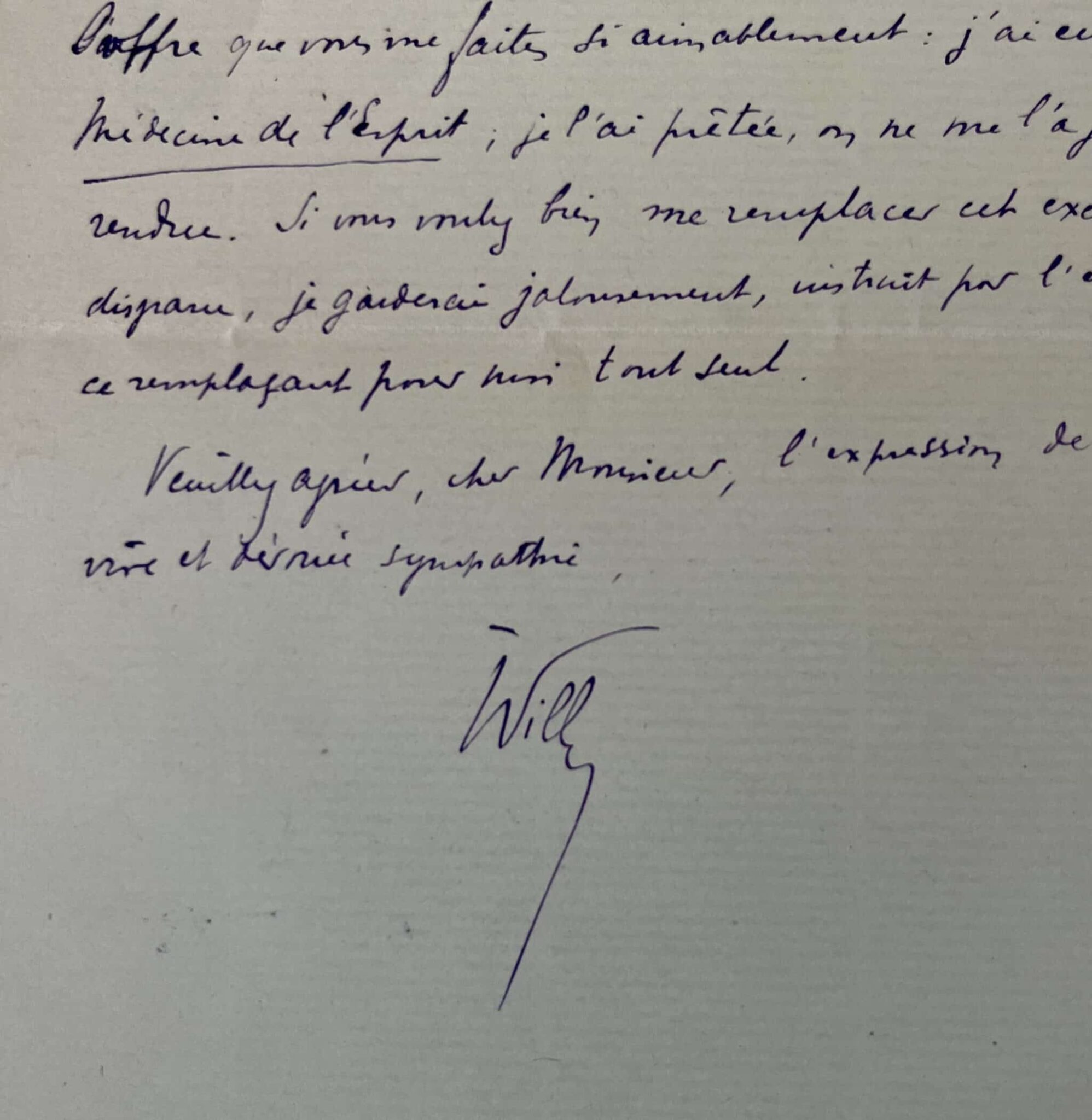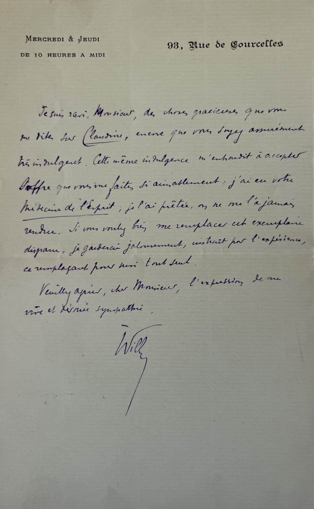 Henry Gauthier-Villars (Willy) (Châtillon-Coligny (Loiret), 1859/1931)"Je suis ravi, Monsieur, des choses gracieuses que vous me dites sur Claudine, encore que vous soyez assurément très indulgent. Cette même indulgence m'enhardit à accepter l'offre que vous me faites si aimablement : j'ai eu votre Médecine de l'Esprit [Introduction à la médecine de l'esprit] ; je l'ai prêtée, on ne me l'a jamais rendue. Si vous voulez bien me remplacer cet exemplaire disparu, je garderai jalousement, instruit par l'expérience, ce remplaçant pour moi tout seul".