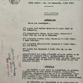Contrat de création de « Littérature et philosophie » signé par Jean-Paul Sartre, Simone de Beauvoir, Merleau-Ponty, Jacques-Laurent Bost et Jean Cau.
